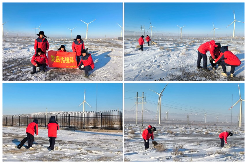 同一時(shí)間,公司第三黨支部也在達(dá)坂城風(fēng)電場(chǎng)區(qū)域開(kāi)展志愿勞動(dòng)活動(dòng)。大家在完成機(jī)組運(yùn)維工作的間隙,主動(dòng)拿起工具,清理場(chǎng)站周邊道路及公共區(qū)域的垃圾。大家不畏嚴(yán)寒,以高度的責(zé)任感和團(tuán)隊(duì)協(xié)作精神,迅速投入到垃圾清撿工作中,對(duì)角落及設(shè)備周邊的垃圾進(jìn)行細(xì)致清理,確保每一處通道都安全暢通,每一臺(tái)設(shè)備都能正常運(yùn)行。忙碌的身影在場(chǎng)站中穿梭,與遠(yuǎn)處旋轉(zhuǎn)的風(fēng)機(jī)遙相呼應(yīng),共同構(gòu)成了一幅冬日里充滿(mǎn)溫情與力量的畫(huà)卷。