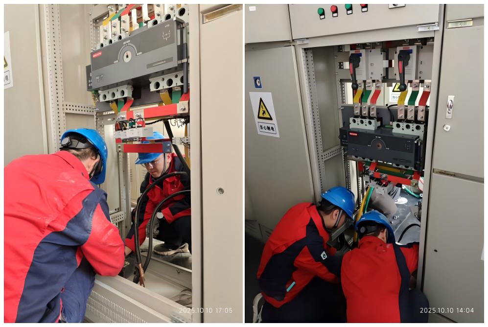 施工過程嚴格依照預(yù)定計劃有序開展。運維人員首先對兩路380V交流電源進行停電操作,隨后拆除原柜體及連接線,緊接著快速完成新配電柜安裝、母排與電纜接線,并同步對ATS裝置進行調(diào)試。整個施工過程僅停電6小時,未對場站正常運行及機組出力造成任何影響。