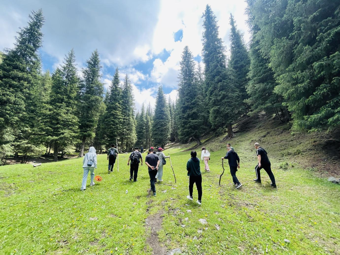 天山草場草色如茵、綠意盎然,如畫的風景令人心曠神怡。大家健步走在徒步大道上,呼吸著新鮮的空氣,感受著大自然的風光。一路上,大家邊走邊聊,時而駐足欣賞,時而選景拍照,歡歌笑語如影隨形。本次徒步行程近5公里,大家互相鼓勵、一往無前,經(jīng)過一個半小時的努力,終于順利抵達目的地。