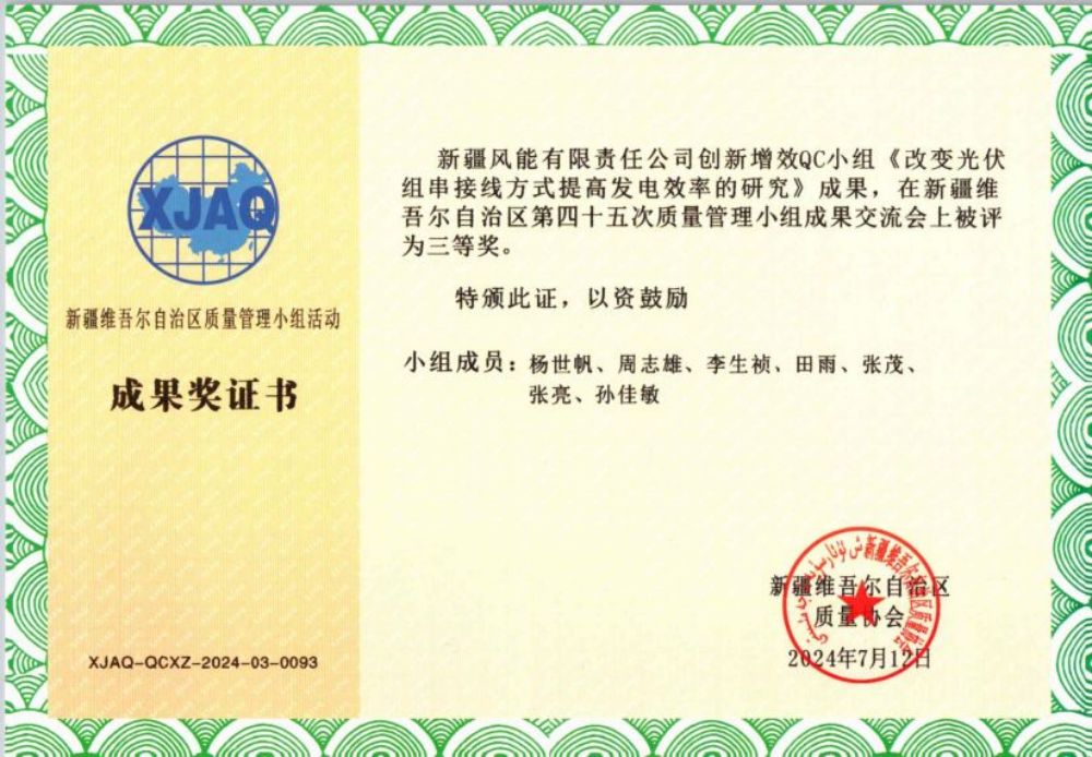 此次交流會(huì)風(fēng)能公司提交了三項(xiàng)Q C課題成果,與來自全疆各地的289個(gè)優(yōu)秀項(xiàng)目同臺(tái)競技。歷經(jīng)專家評審團(tuán)的嚴(yán)格考察與綜合評定,最終,公司榮獲“表現(xiàn)突出集體”的稱號。其中“改變光伏組串接線方式提高發(fā)電效率的研究”項(xiàng)目喜獲三等獎(jiǎng),成為公司質(zhì)量管理與技術(shù)創(chuàng)新征程上一座新的里程碑。